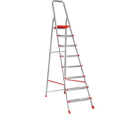 Стремянка Gigant 8 ступеней с шириной 130 мм, PROFI AAA-10 имеет высокую дугу безопасности (600 мм). Cтраховочные ремни - безопасная эксплуатация. Широкие ступени глубиной 130 мм. Опорные пластиковые наконечники против скольжения. Рифленые ступени и площадка - безопасный подъём и спуск. Прочное крепление ступеней к боковинам 6 заклепками - отличная устойчивость. Cтупени и стойки изготовлены из прессованных алюминиевых профилей увеличенного сечения, площадка - из прочного композитного материала.