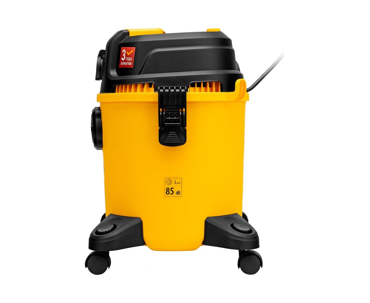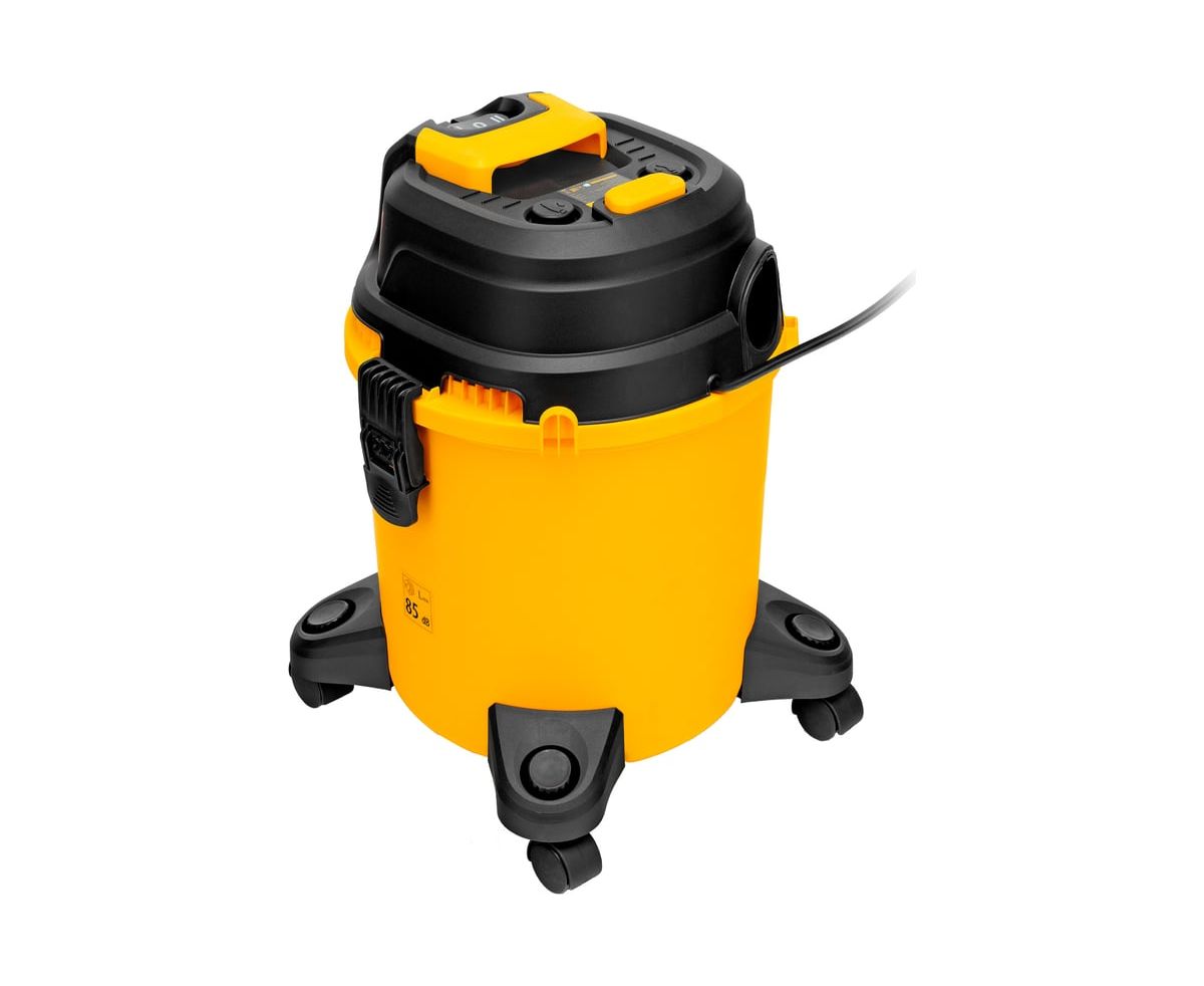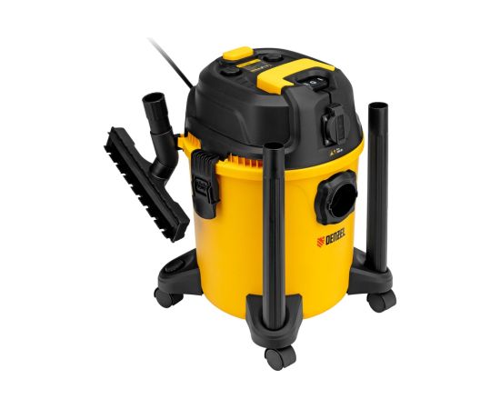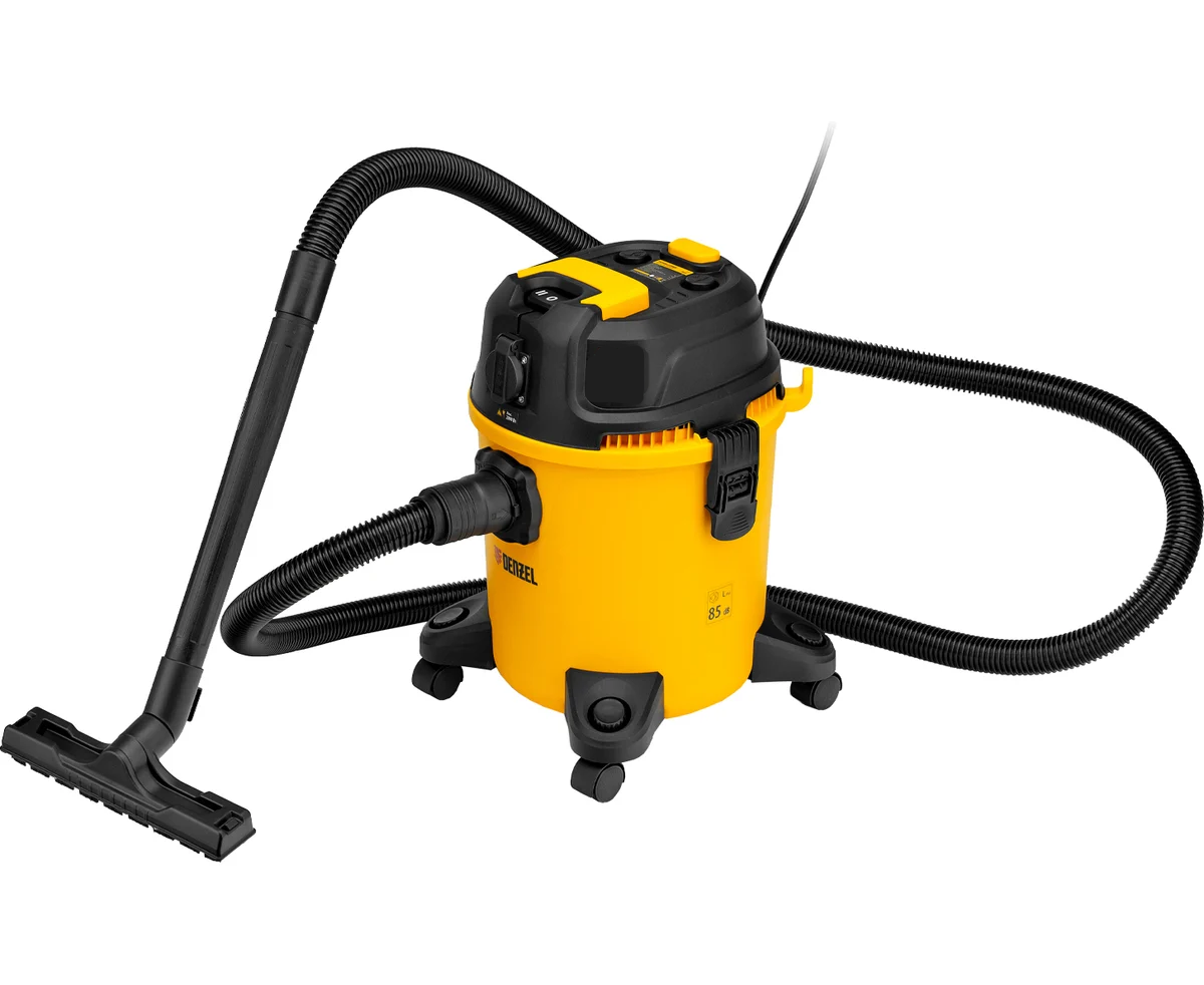 Пылесос строительный Denzel RVC20 28202 мощностью 1400 Вт, с баком объемом 20 л и шлангом длиной 3 м, оснащен розеткой с автосинхронизацией и предназначен для уборки бетонной, кирпичной пыли, опилок, стружки и других твердых отходов.