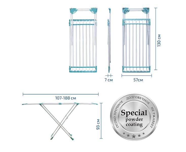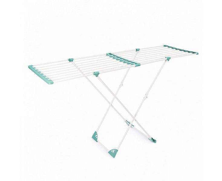 Напольная сушилка для белья AURA Deluxe X это практичное решение для сушки белья дома. Конструктивная особенность сушилки позволяет установить подходящую длину прутьев с помощью телескопического сдвижения. Колесные опоры обеспечивают легкое передвижение сушилки по дому. Диаметр металлических прутьев позволяет сушить белье без заломов. Качественное порошковое окрашивание металлических элементов конструкции защищает от образования ржавчины. Полезная длина для навески белья 20 метров.