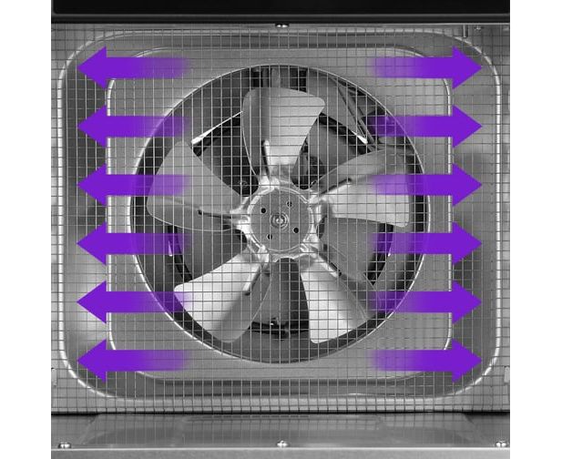 В сушилке установлен мощный нагревательный элемент и вентилятор с лопастями большого диаметра, обеспечивающий равномерное распределение нагретого воздуха по всему объему камеры. Благодаря горизонтальному обдуву смешение запахов при сушке одновременно разных продуктов минимально.