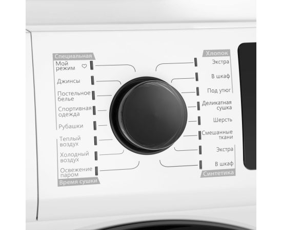 Угол открытия дверцы 180 градусов при диаметре люка 375 мм делает процесс загрузки и извлечения одежды из сушильной машины простым и удобным.