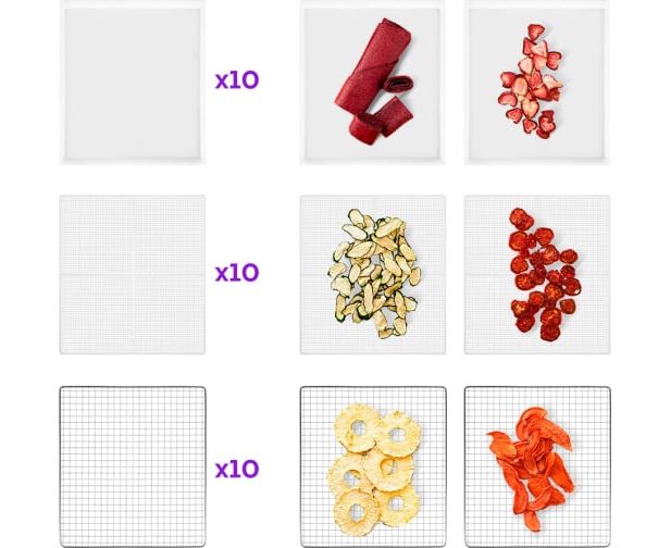 В комплекте к сушилке идут 10 металлических поддонов, 10 сеток для мелких продуктов и 10 сплошных пластиковых поддонов.