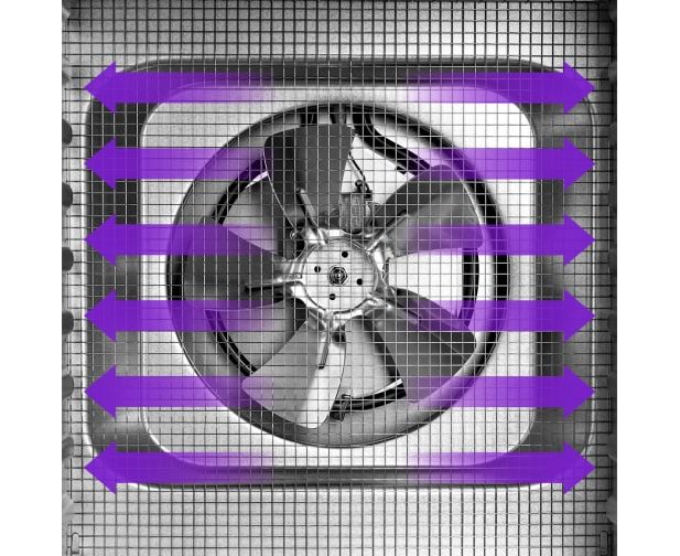 В сушилке установлен мощный нагревательный элемент и вентилятор с лопастями большого диаметра, обеспечивающий равномерное распределение нагретого воздуха по всему объему камеры. Благодаря горизонтальному обдуву смешение запахов при сушке одновременно разных продуктов минимально.