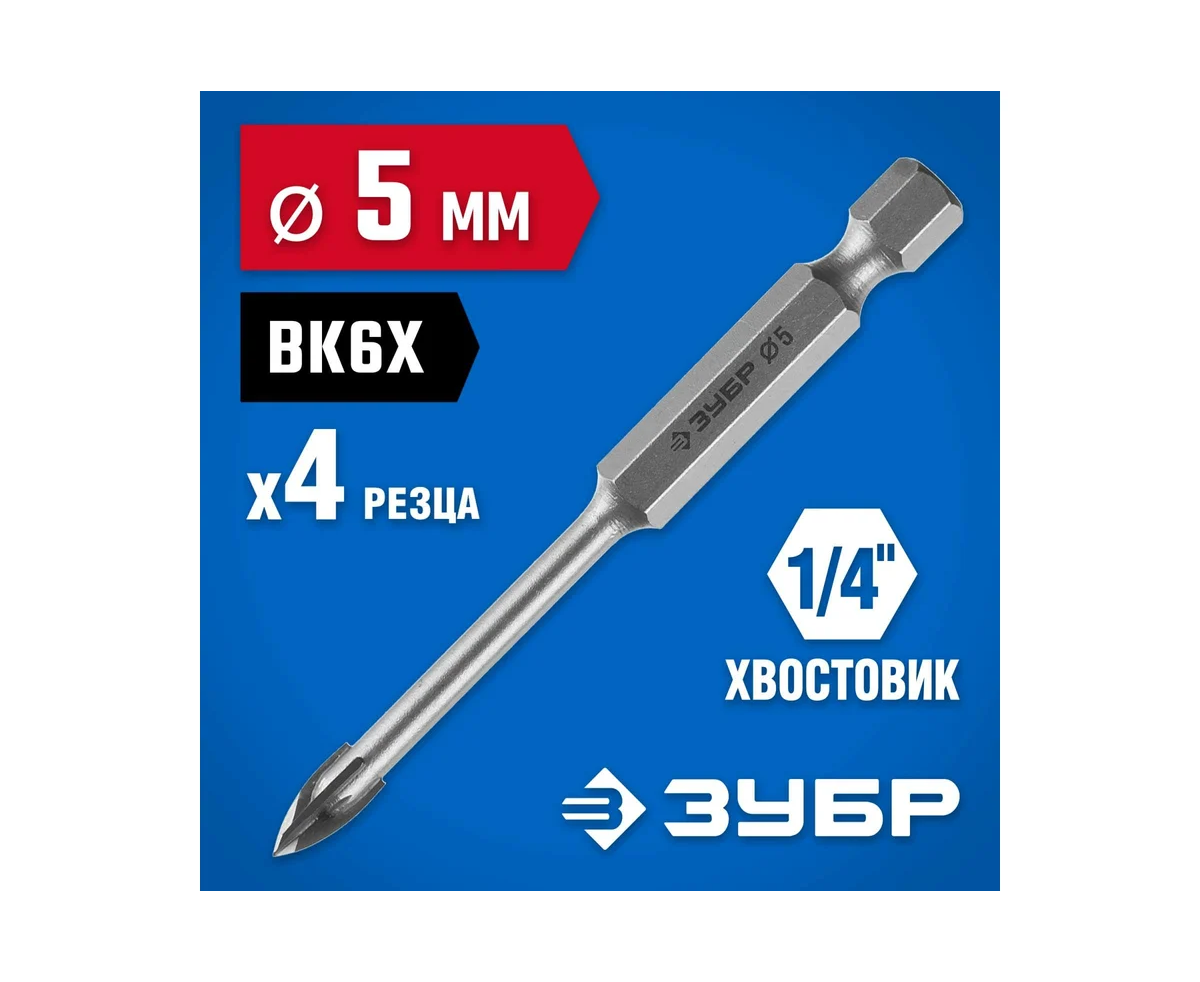 Сверло Зубр 29845-05_z01 по каф/керамогр/стек Д-5мм Дл-75мм для шуруповертов/дрелей