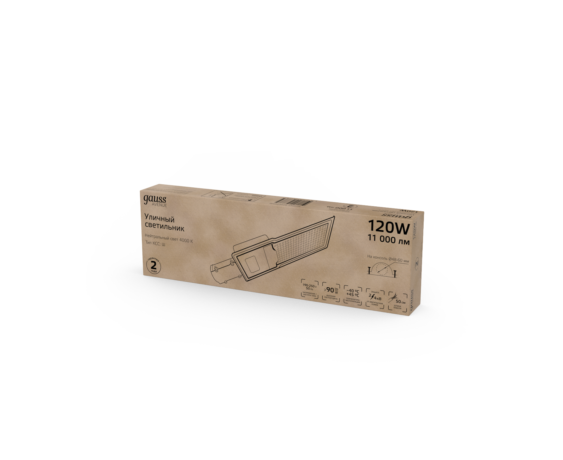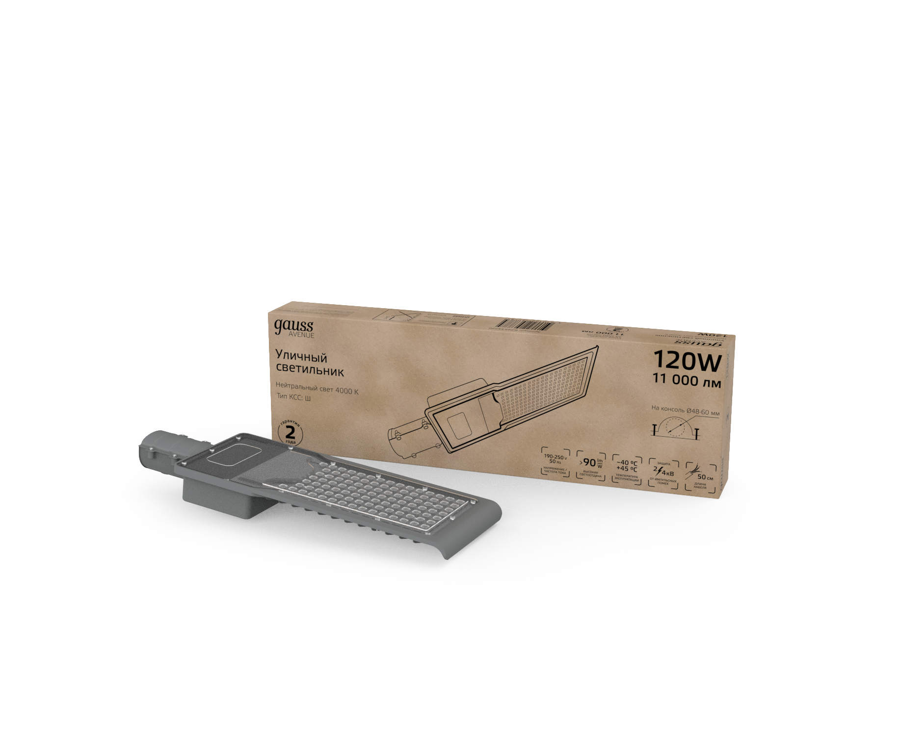 Светильник уличный Gauss LED Avenue 120W это консольный LED светильник, корпус которого изготовлен из анодированного алюминия и прозрачного пластикового рассеивателя. У него высокий уровень пылевлагозащиты IP 65 и защиты от импульсных помех. Светильник легко монтируется на консоль. Работает в большом диапазоне температур от -40 до +45°С и имеет холодный белый свет 4000К, который дает максимальное освещение необходимой территории. Светильник не боится грозы, может использоваться для освещения улиц, участков дорог, придомовых территорий, парковых аллей.