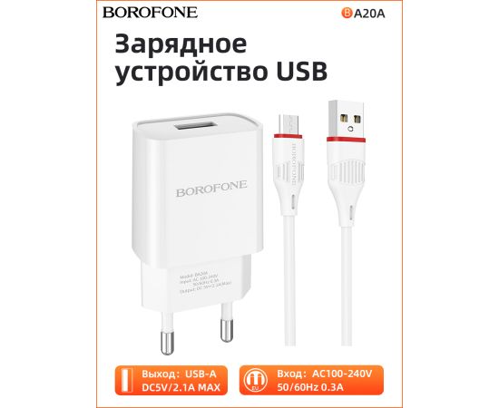 СЗУ BOROFONE BA20A Sharp 1USB, 5V, 2,1A + Micro (белый)
