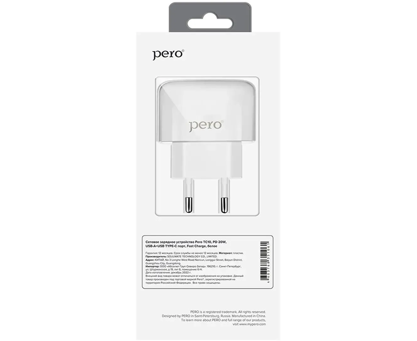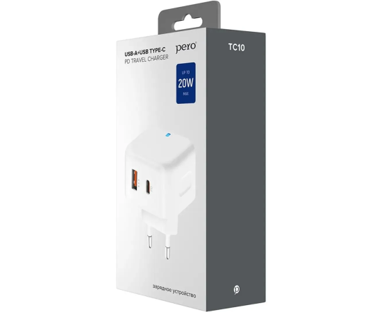СЗУ PERO TC10 USB-C 20W + USB-A (ТС10WHPD) Fast Charge белый