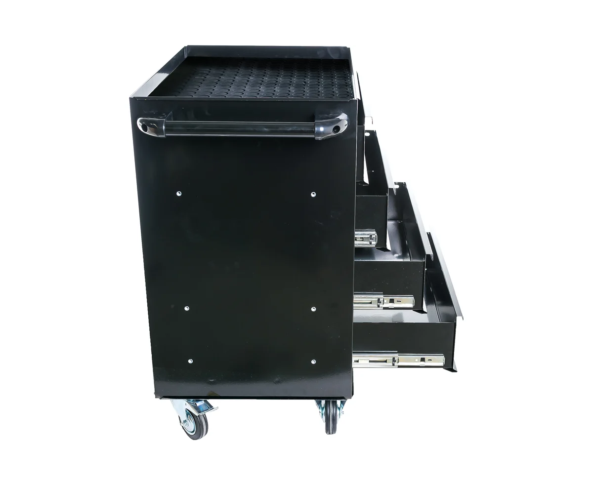 С помощью колес и ручки тележка легко и быстро перемещается по рабочей площадке. Верх конструкции покрыт резиновым материалом, который препятствует скольжению рабочего инструмента. Максимальная нагрузка на ящик - 30 кг. Толщина металла составляет 0.8 мм.