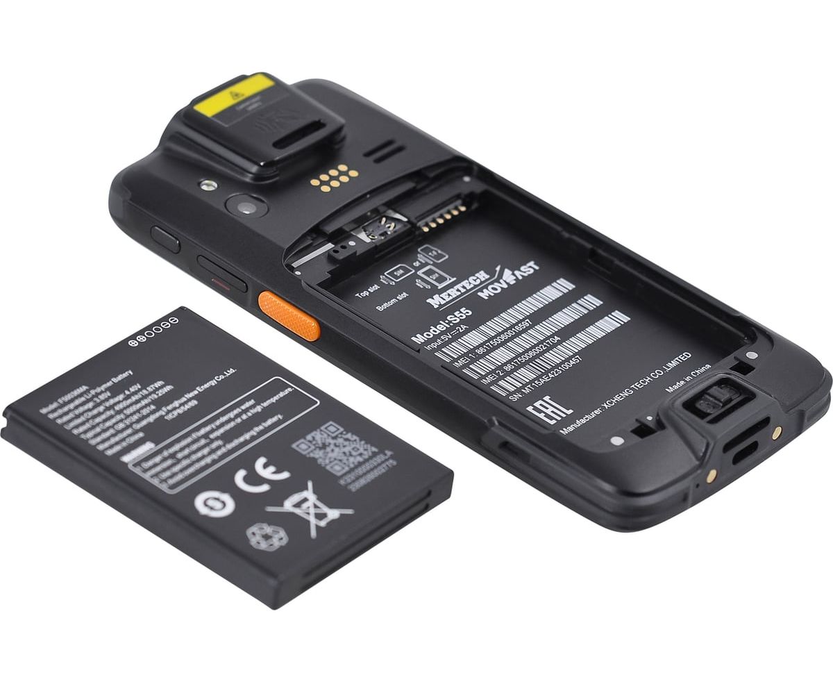 ТСД MERTECH MovFast S55 по конструкции напоминает смартфон. Сенсорный дисплей занимает большую часть площади лицевой панели. Экран с диагональю 5. 5 дюймов работает на основе IPS матрицы. У ТСД есть задняя камера 13 Мпикс и фронтальная камера на 5 Мпикс. Корпус терминала изготовлен из ударопрочного пластика и поликарбоната. Устройство выдержит многократные падения с 1,5 м. Защита корпуса по стандарту IP67 позволяет работать с ТСД при высокой влажности и в пыльных помещениях. MERTECH MovFast S55 оснащен сканирующим модулем 2D Image. Встроенный сканер с широким углом охвата ускоряет работу оператора.