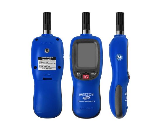 МЕГЕОН 20066 – новинка в модельном ряду цифровых высокочувствительных термогигрометров. Представленный прибор внесен в ГРСИ по номером 89786-23 и предназначен для быстрого определения параметров температуры и влажности с высокой точностью в помещениях и на открытом пространстве. Помимо этого с его помощью можно зафиксировать максимальные и минимальные значения измеренных данных. Преимуществом также является функция записи результатов в память емкостью 999 ячеек. Измеритель получил современный дизайн и компактные размеры. Модель имеет эргономичную форму корпуса, удобное расположение органов управления на передней панели и большой ЖК- дисплей с яркой светодиодной подсветкой. На заднее стенке предусмотрено монтажное отверстие для установки на штатив, благодаря чему достигается максимальное удобство при эксплуатации.