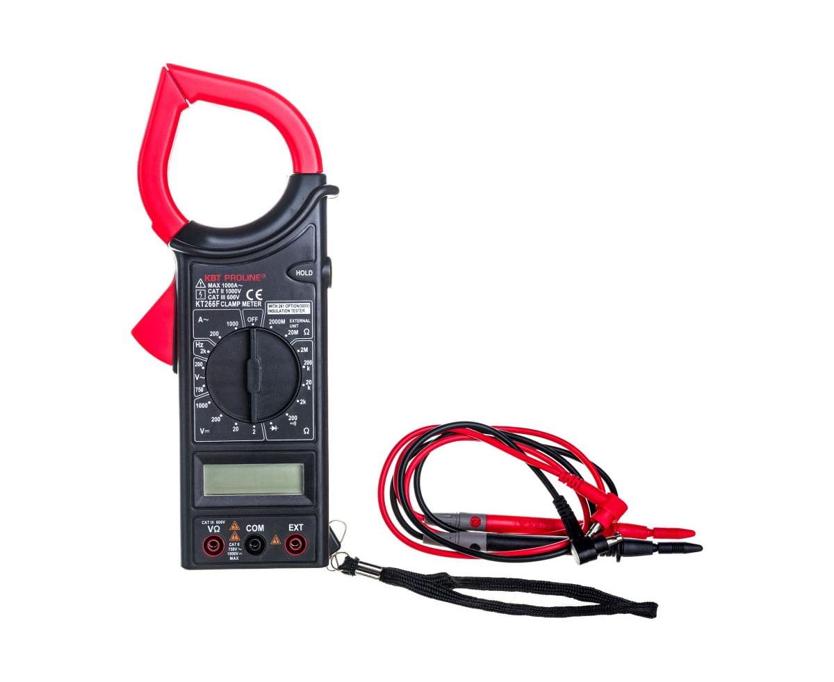 Цифровые токовые клещи КВТ KT 266F PROLINE 79133 измеряет переменный ток, напряжение и сопротивление.
