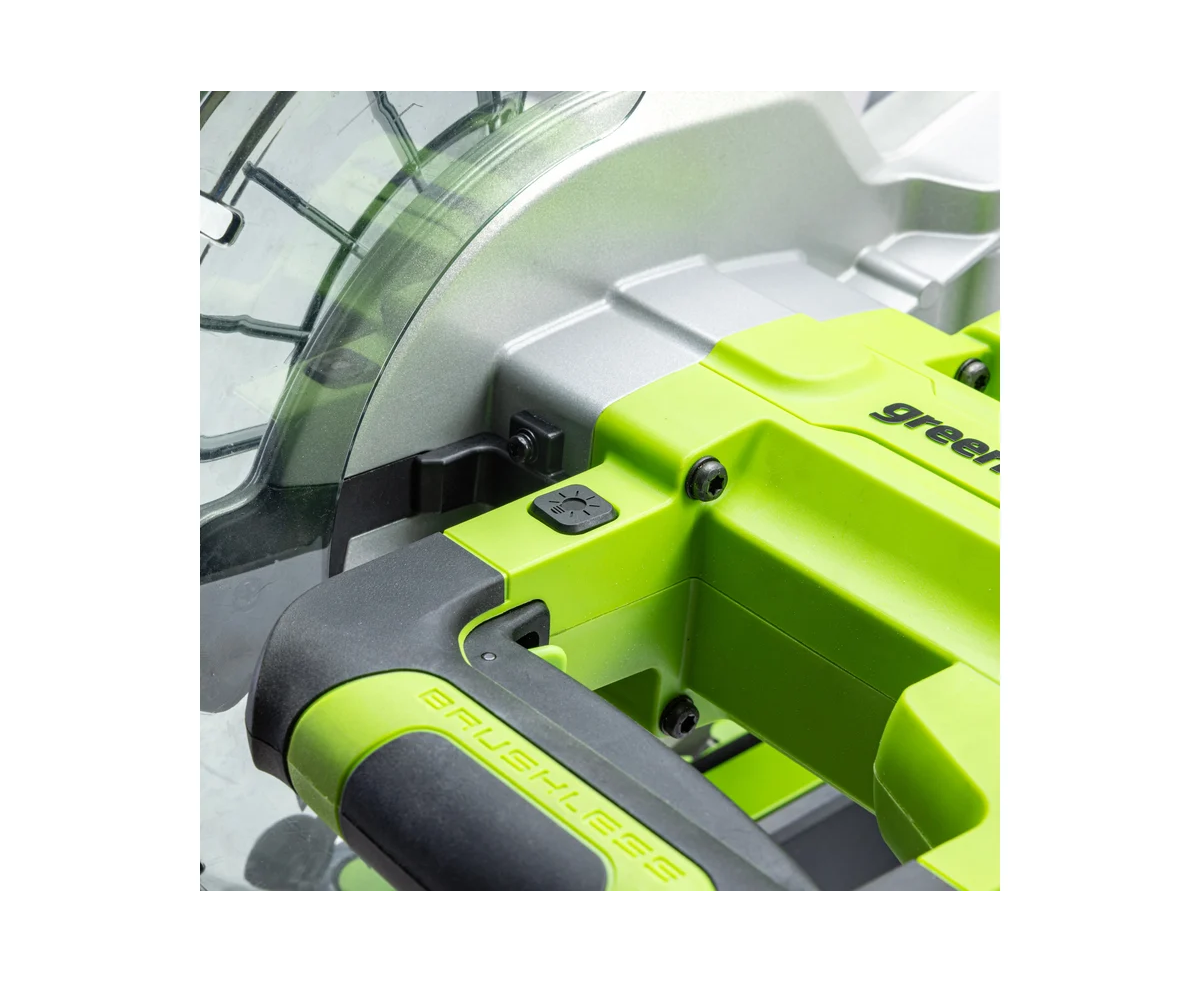 Мобильная производительная аккумуляторная торцовочная пила Greenworks GD24MS216 с функцией протяжки – максимально удобная в эксплуатации.