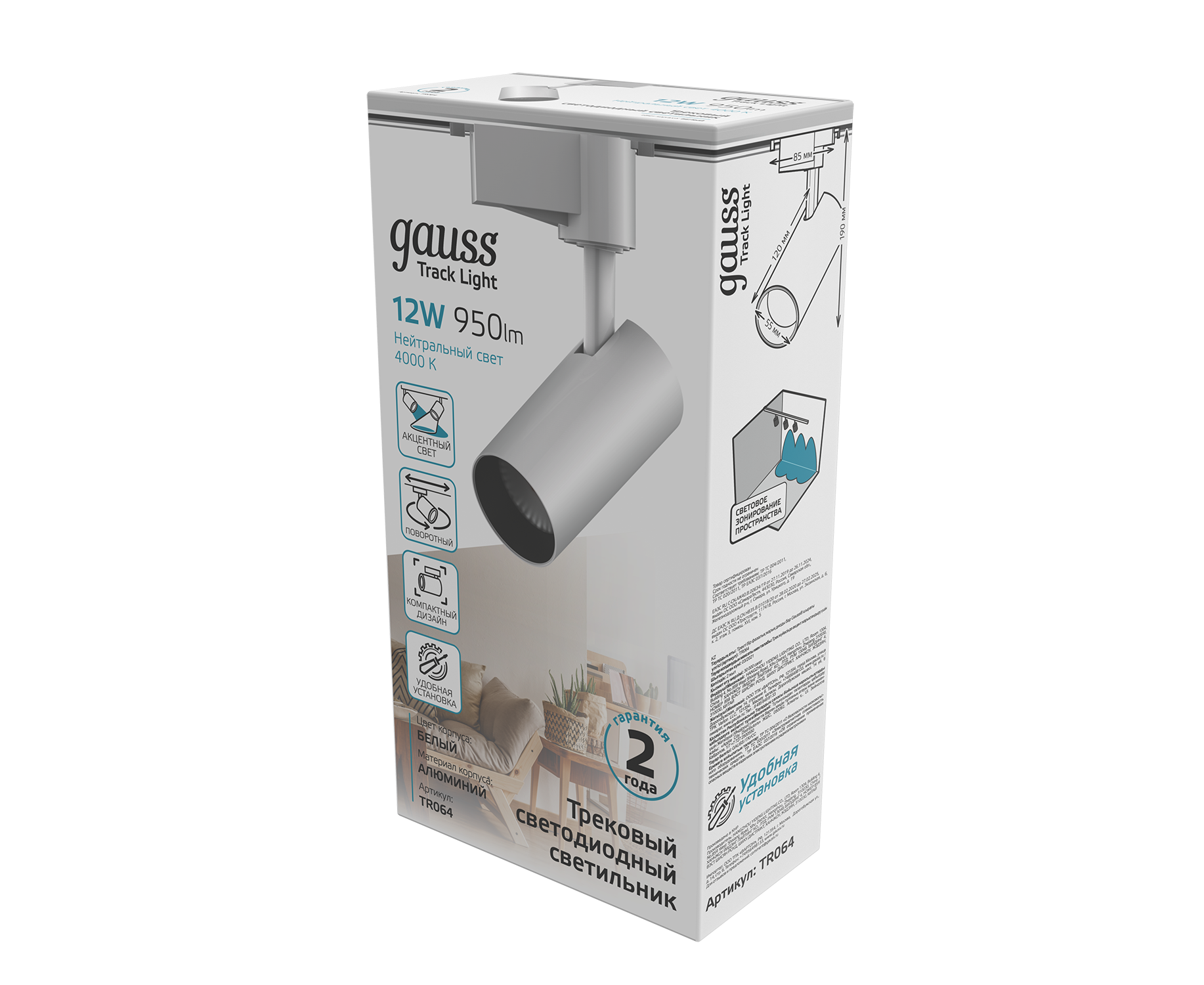 Светильник трековый Gauss цилиндр 12W TR064 это отличный осветительный прибор для создания уютного освещения зон гостинной, спальни, детской, гардеробной, коридора. Может применяться для подсветки витрин магазинов и барных стоек. Компактный дизайн и возможность направить свет в любую точку на стене, витрине или полу в сочетании с легким корпусом дают возможность монтировать светильник как на потолке, так и на любой высоте стены. Спот изготовлен из алюминиевого корпуса, зеркального отражателя и сатинированной линзы. Цвет белый. Встраивается в трековые системы Gauss. Имеет белый нейтральный свет 4000к.