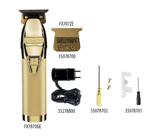 Триммер BaByliss PRO Skeleton FX7870GE - самый известный триммер Skeleton. Металлический корпус. Цифровой мотор с высоким крутящим моментом производит 7200 колебаний в минуту, обеспечивая высокую производительность. Триммер работает с любым типом волос. Мощность подстраивается автоматически в режиме реального времени. Легкий вес прибора, сниженный уровень вибрации и шума гарантируют комфортную работу. Полной обзор рабочей поверхности благодаря используемому открытому лезвию. Возможность настройки нулевого зазор. Неподвижный нож имеет никель-титановое покрытие, а подвижное - DLC (Diamond Like Carbon). Это обеспечивает наибольший комфорт во время работы, т.к. лезвия почти не нагреваются. Для очистки триммера от загрязнений в комплекте поставляются щеточка и масло для лезвий. Петелька для подвешивания предназначена для удобного использования и бережного хранения прибора.