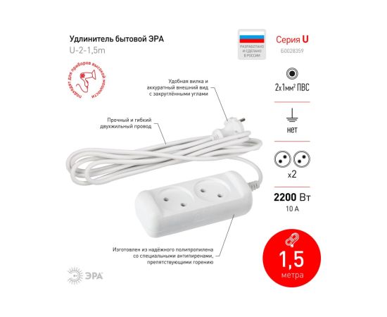 Удлинитель ЭРА U-2-1,5m (Б0028359) 2гн, 1,5м