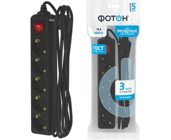 Удлинитель сетевой ФОТОН 22730 16-35ЕS, 3м, 5 розеток, 16А, с выключателем, с заземлением, черный