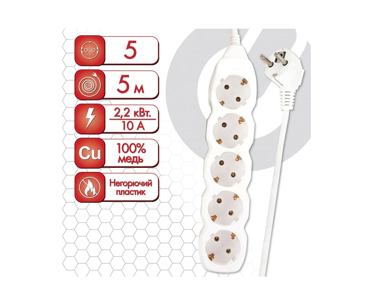 Удлинитель сетевой SONNEN U-155G (511437) 5 розеток, c заземлением, 10А, 5м, белый