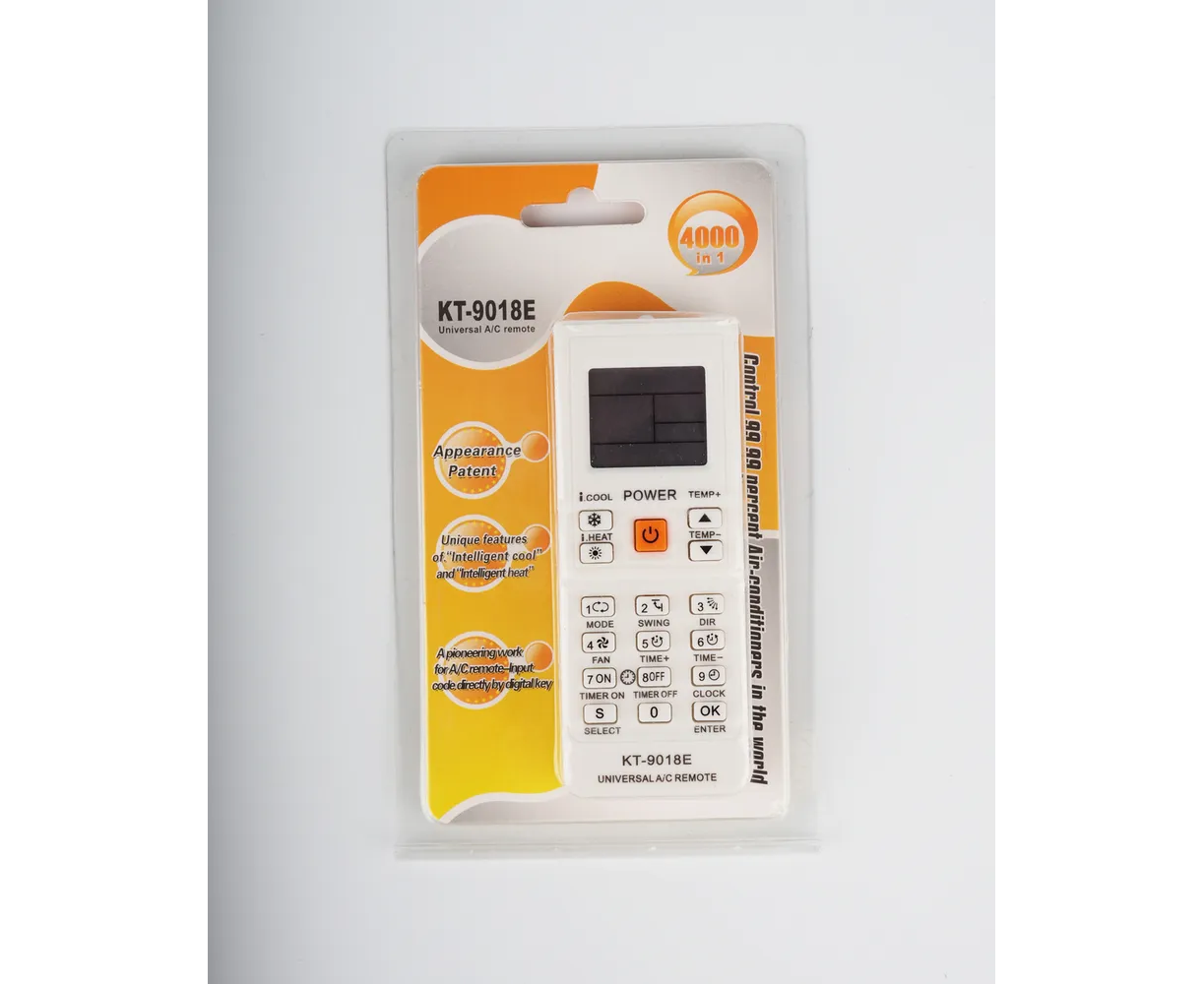 Универсальный пульт KT-9018E подходит на большинства сплит систем, 4000 кодов для разных фирм кондиционеров. Заменяет БЕСПРОВОДНЫЕ пульты от кондиционеров. Пульт KT-9018E высокого качества и прост в использование. Пульт необходимо настроить на вашу модель кондиционера. Он имеет функции как автоматического поиска , так и ручного поиска кода. Подробная инструкция прилагается к пульту. Автоматическим режимом можно воспользоваться, если вы не знаете какой у вас кондиционер или в таблице кодов нет вашей модели кондиционера. На пульте расположены основные функции: кнопка включения/выключения, регулировка температуры, выбор режимов, регулировка вентилятора, регулировка направления воздушного потока, таймер и часы.