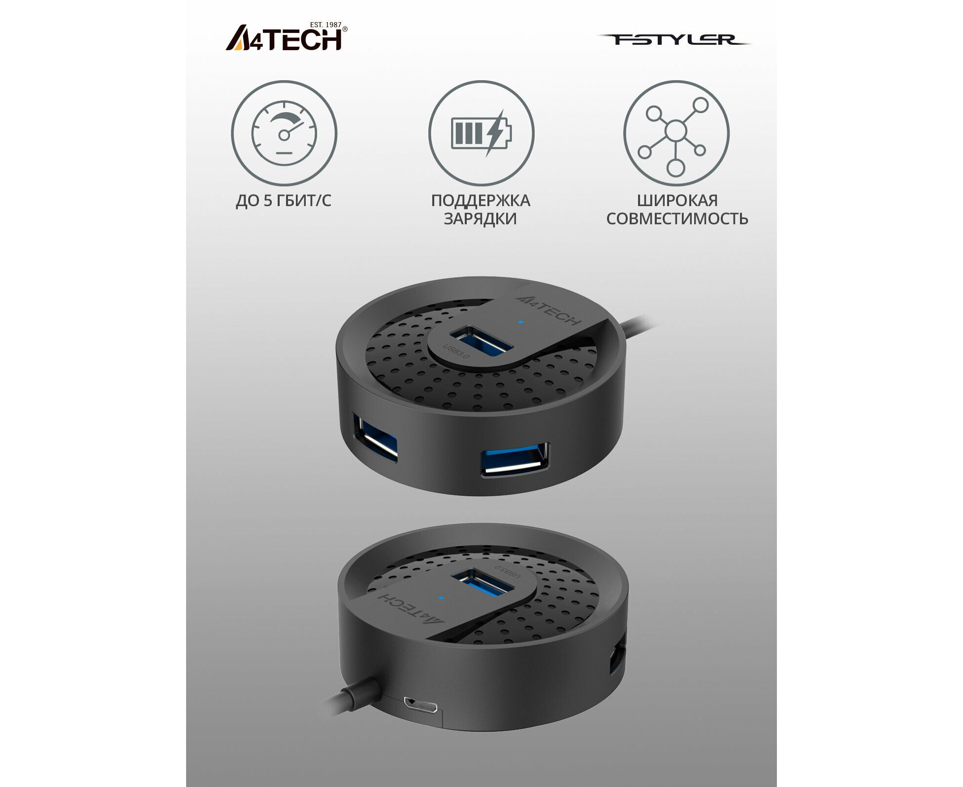 USB-хаб A4Tech HUB-30C 4xUSB 3.0, 1 (для питания)xUSB-C, черный