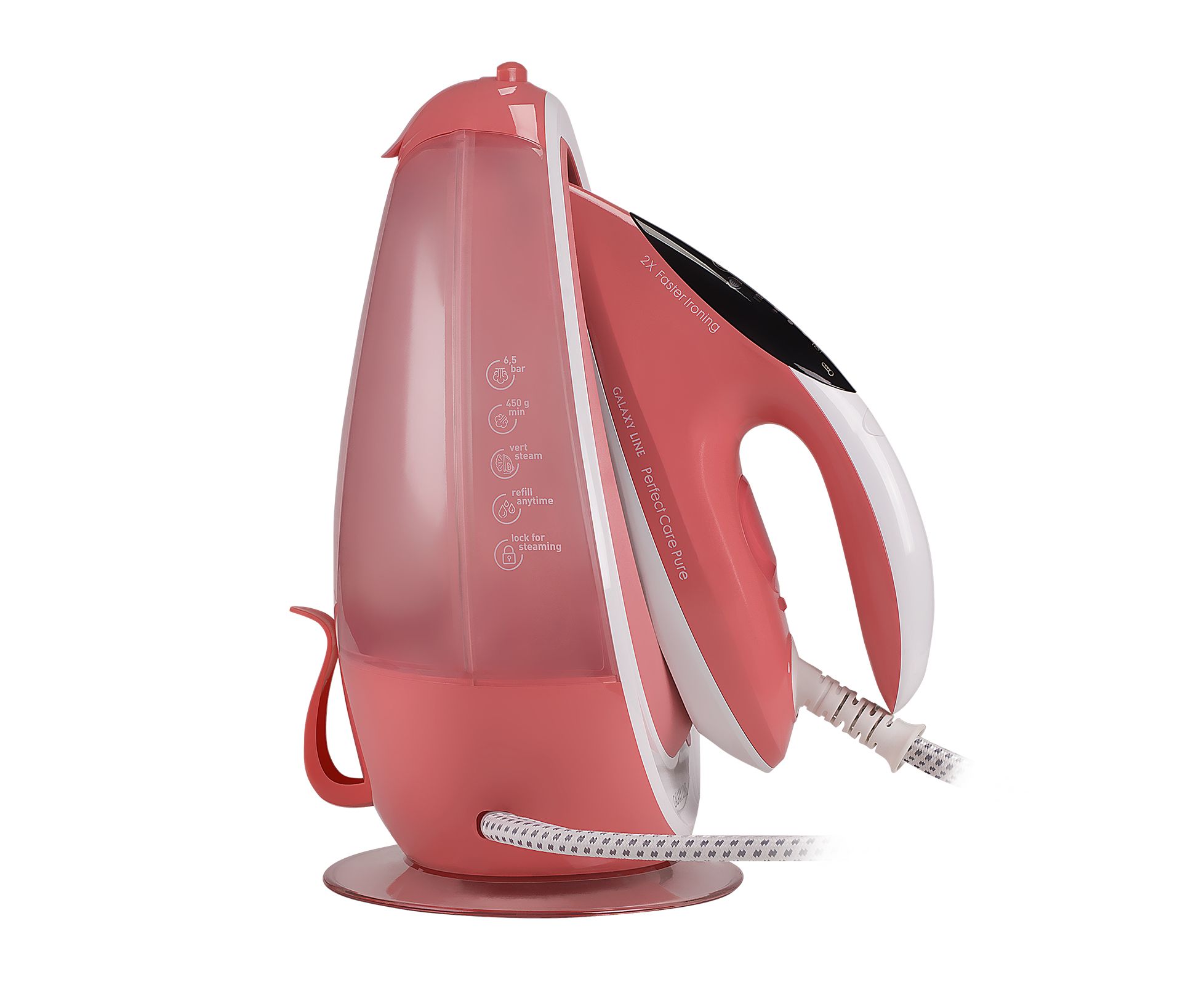 В комплекте: утюг, база, мерный стакан, запасной сменный фильтр для сбора накипи, руководство по эксплуатации