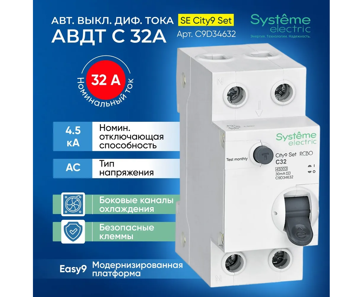 Технические характеристики Systeme Electric City9 set авдт 1p+n с 32а 4.5ka 30ма тип-aс 230в C9D34632