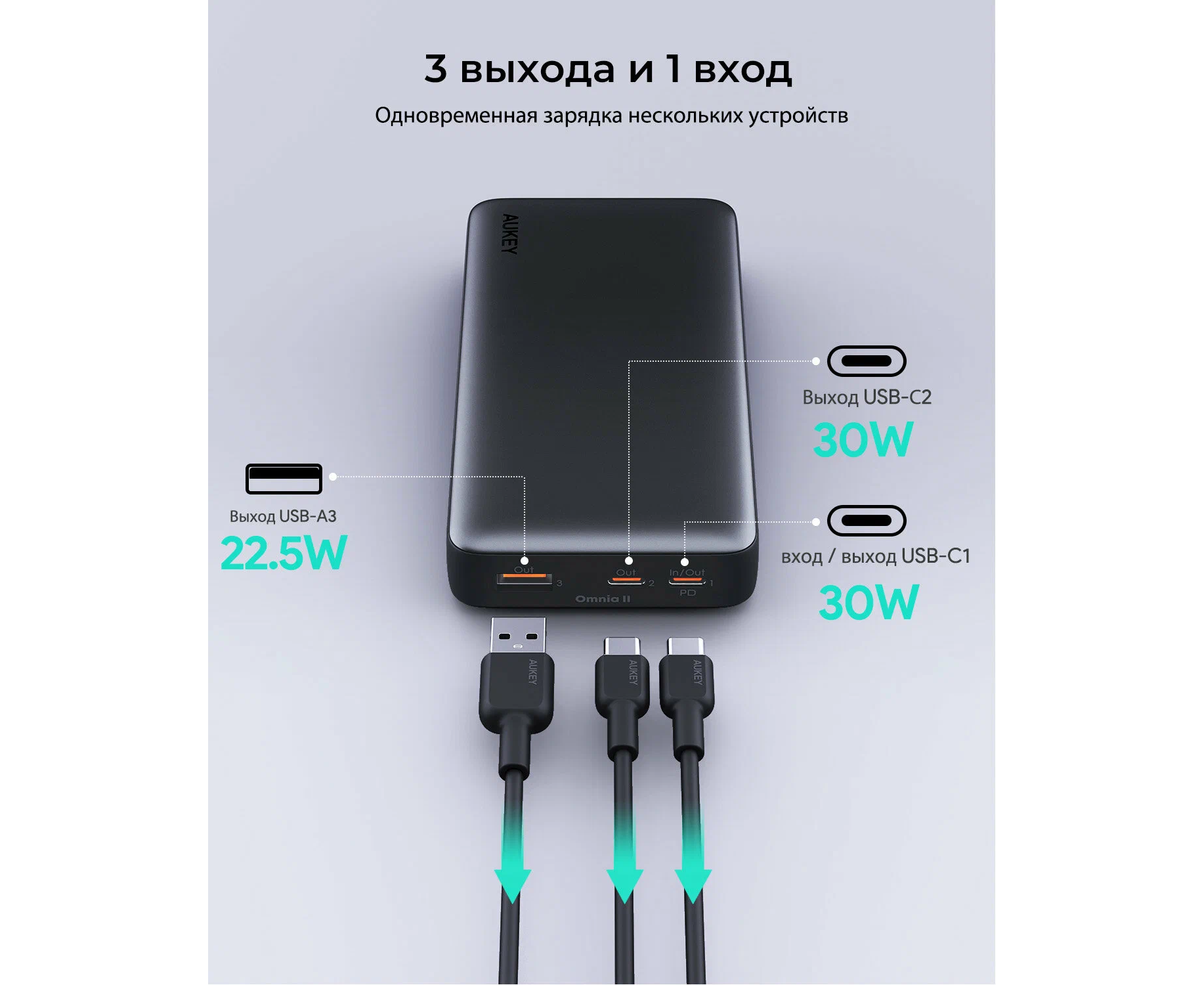 Аккумулятор оснащен сквозной зарядкой, что позволяет заряжать его, когда он подключен к заряжаемому устройству. Это обеспечивает непрерывную зарядку и позволяет вам не беспокоиться о том, что аккумулятор разрядится в самый неподходящий момент. Кроме того, вы можете заряжать несколько устройств одновременно.