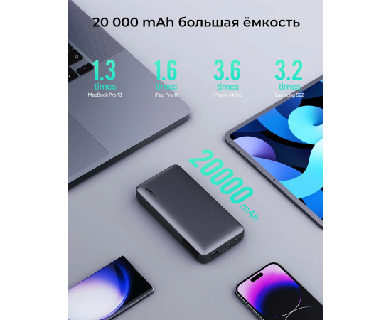 Внешний аккумулятор Aukey Sprint X — это портативное устройство, которое обеспечивает быструю и эффективную зарядку iPhone, Macbook Air и некоторых небольших ноутбуков. Емкость аккумулятора составляет 20 000 мАч.