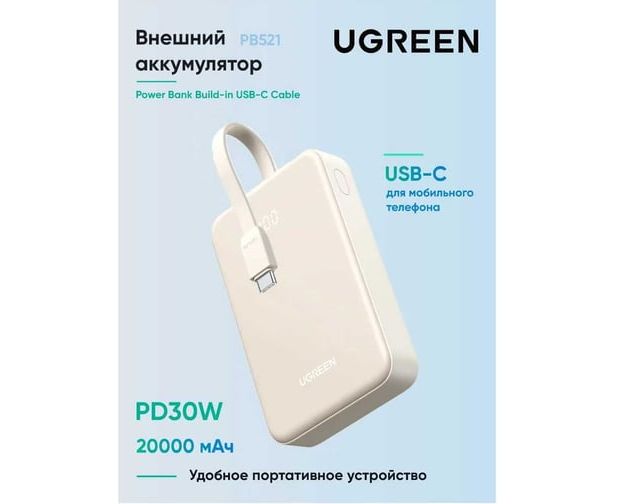 Внешний аккумулятор UGREEN PB521 (45207) 20000mAh PD30W Build-in USB-C Cable - White