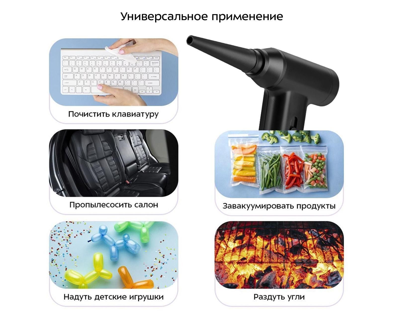 6 насадок в комплекте: универсальная, удлиненная, насадка-щетка, для накачки небольших и крупных надувных изделий, вакуумная насадка.