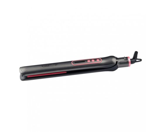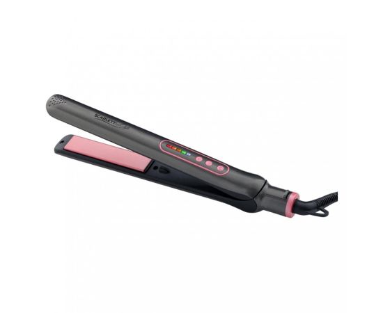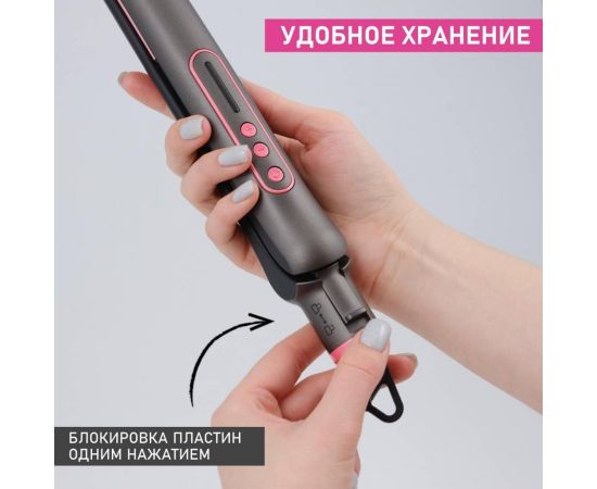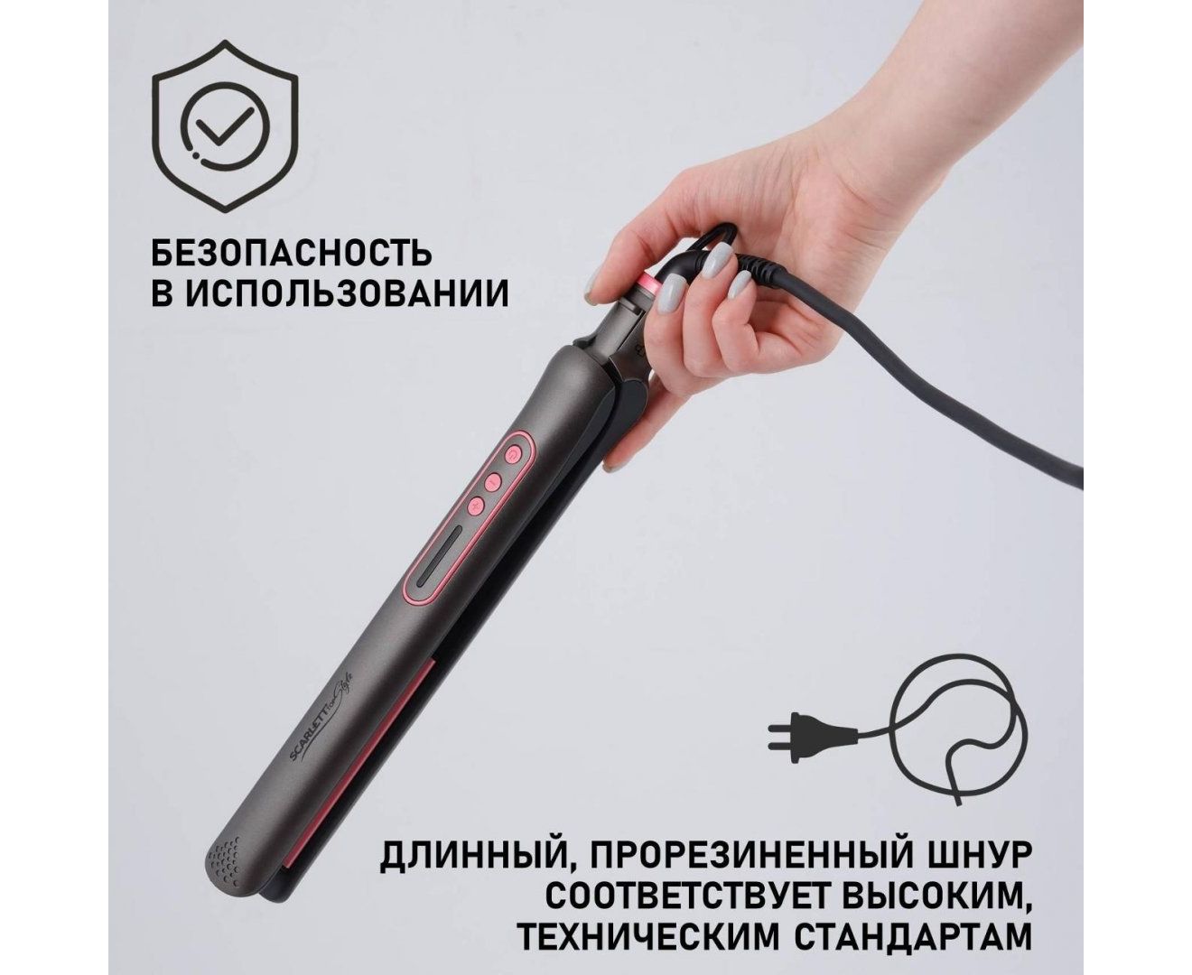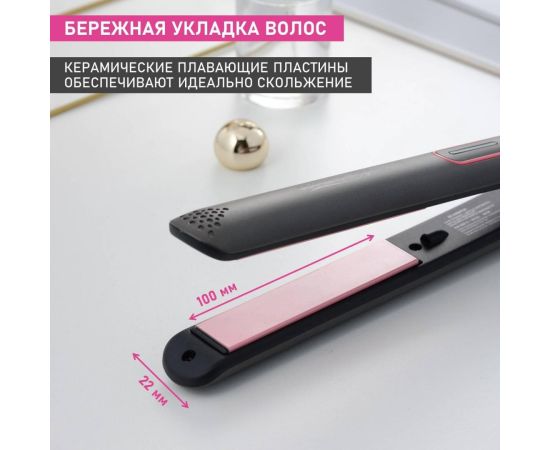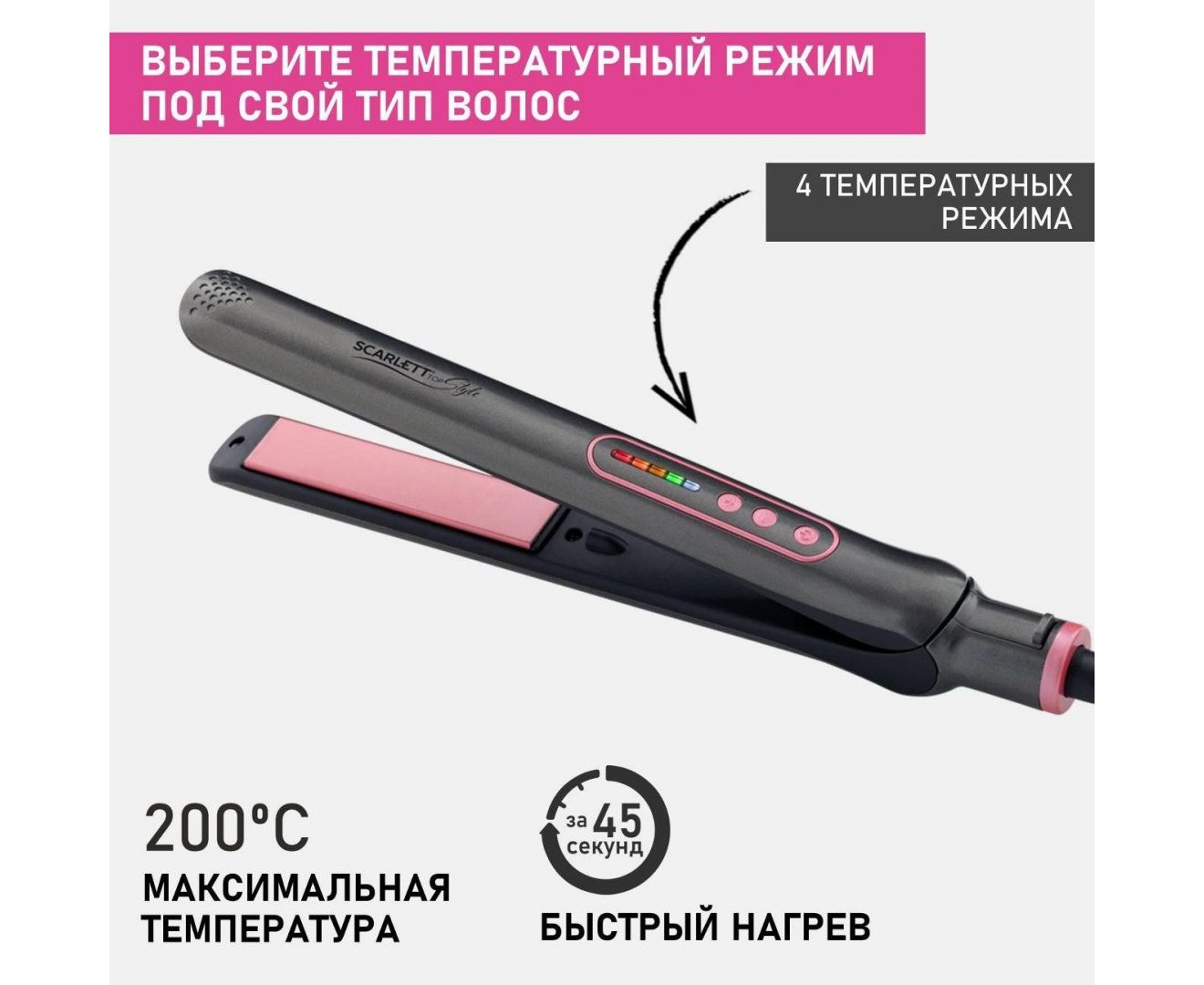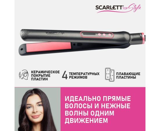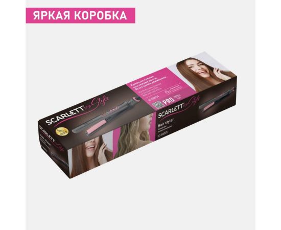 Scarlett SC-HS60T25 оснащен механизмом отключения при перегреве и термоизолированным наконечником. Температура достигает 200°С. Для нагрева требуется около 60 секунд. Регулировка температуры плавная - предусмотрено четыре режима. Пластины с керамическим покрытием хорошо удерживают тепло и равномерно нагреваются. Предусмотрена возможность их фиксации. Индикаторы сообщают о включении прибора, готовности к работе, режиме нагрева и температуре. Корпус окрашен в серый и розовый цвета.