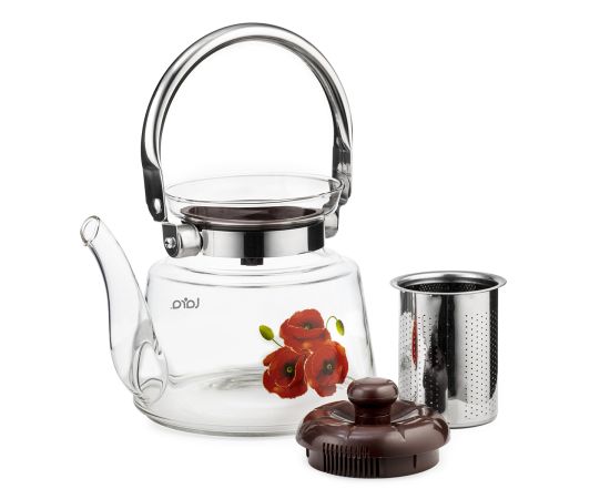 Отличный заварочный чайник LARA подойдёт для большой семьи, где любят и ценят чай. С его помощью вы сможете приготовить 5-6 порций ароматного напитка любых сортов и разновидностей. Рисунок на колбе в виде цветка дополняет образ, что позволяет чайнику вписаться в любой интерьер. При изготовлении были выбраны экологически чистые и безопасные материалы. Высококачественное жаропрочное стекло подходит для электрических и газовых плит, вы можете смело ставить чайник на открытый огонь. Ручка из нержавейки и жароупорная бакелитовая крышка не нагреваются. Жёсткий фильтр для заваривания из нержавеющей стали легко снимается для мытья и очистки.