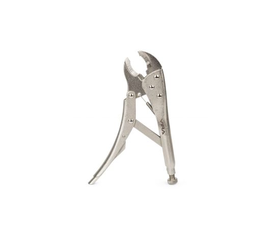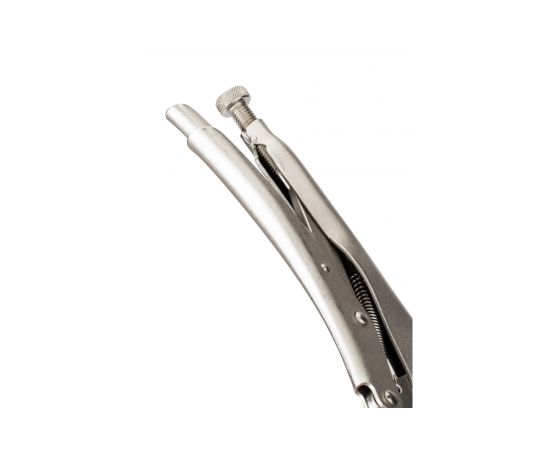 Зажим с фиксатором — инструмент для захвата и фиксации плоских элементов и деталей неправильной формы. Используется при проведении слесарных, монтажных и сварочных работ. Изготовлены из углеродистой стали. Твердость по шкале Роквелла составляет 40 HRC. Приспособление имеет рукоятки с фиксирующим винтом.