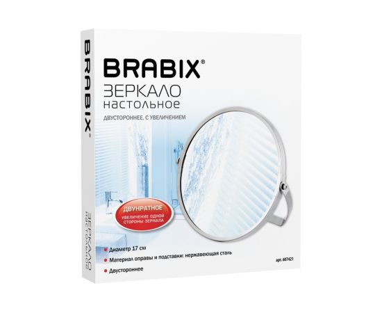 Зеркало настольное BRABIX 607421 круглое, диаметр 17см, двустороннее, с увеличением, рамка из нержавеющей стали