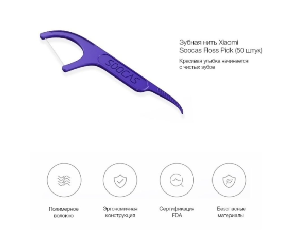 Зубная нить Soocas Floss Pick способна без вреда для зубной эмали легко скользить между зубами и выталкивать застрявшие остатки пищи. Нить не растягивается, не разрывается и не ломаются, даже если зубы плотно прилегают друг к другу. Зубная нить это обязательный и полезный аксессуар для ухода за зубами и полостью рта в течение дня. Вы можете быть уверены, что между зубами не застряли кусочки пищи, провоцируя развитие колоний вредных бактерий, разрушающих эмаль зубов. Xiaomi Soocas Floss Pick комфортная зубная нить с удобным изогнутым держателем. Нить изготовлена из высокомолекулярного волокна и мягко проскальзывает между зубами, обеспечивая качественное очищение. Мягкая и гладкая зубная нить Xiaomi Soocas Floss Pick не повреждает эмаль и отлично полирует поверхность зубов. Нить не растягивается и не рвется. Держатель зубной нить выполнен из безопасного прочного пластика. Изогнутая дуговая рукоятка позволяет легко и без лишних усилий добраться до всех зубов.Зубочистка с нитью floss для профессионального ухода за полостью рта